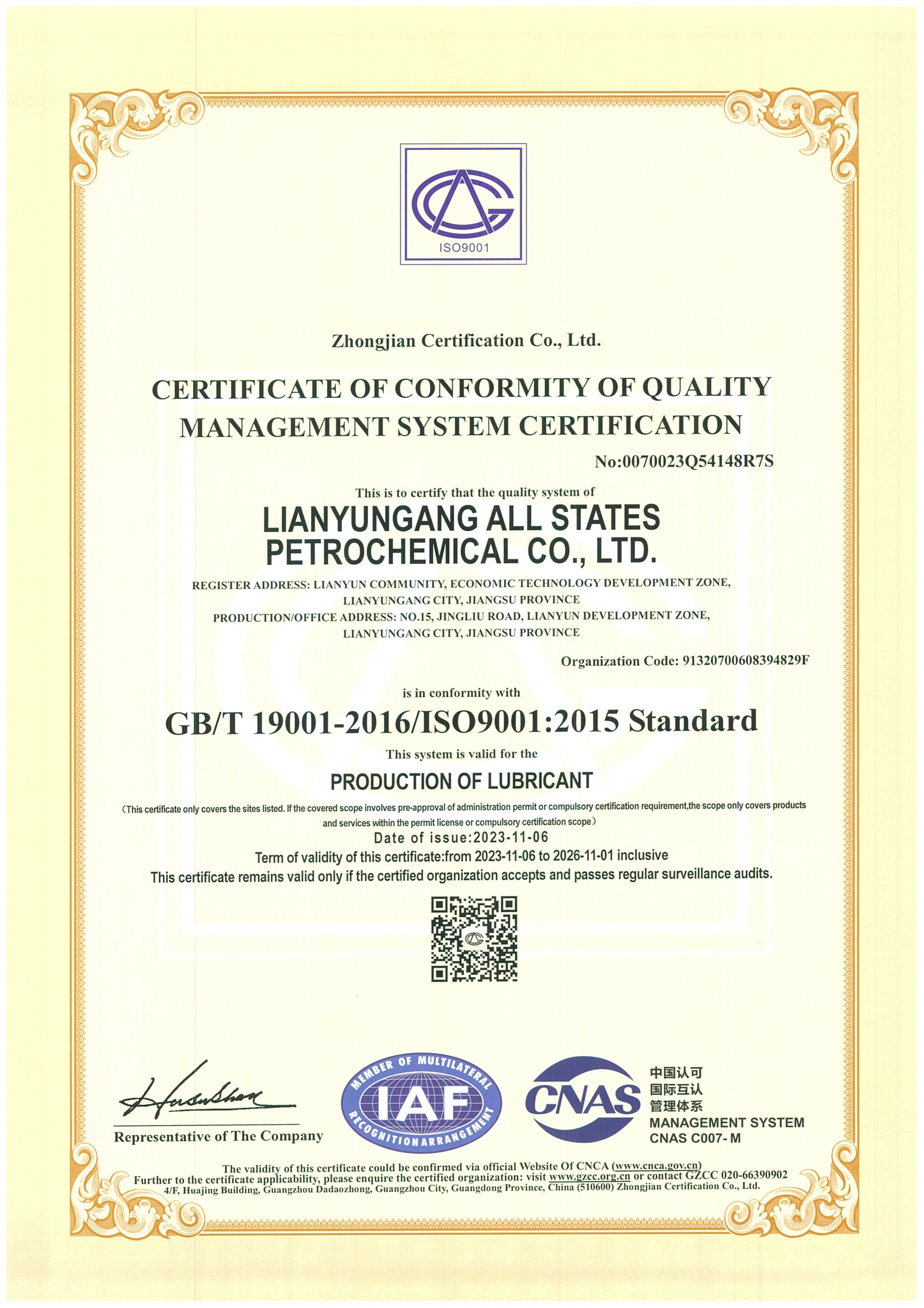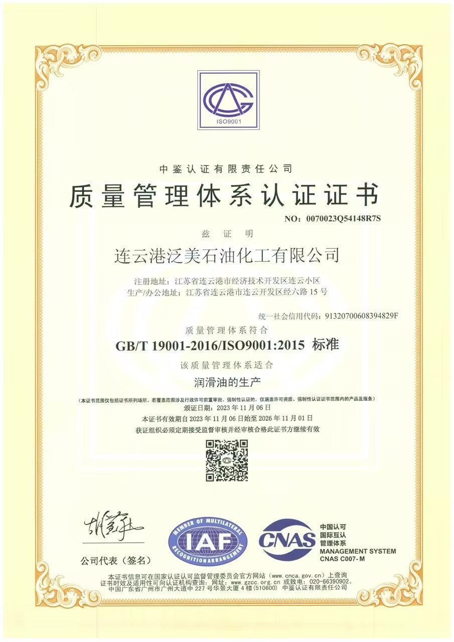 润滑油产品的质量主要取决于三方面:一、原料的选用;二、调和方案的组成;三、加工设备及工艺。泛美连云港中国工厂通过进行国际合作,提升管理,产品结构日趋完善,所有ALL STATES(泛美)油品在性能、质量、环保方面均已达到美国石油协会(API)标准要求..
